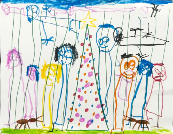 I drew a Christmas tree, the two ants, and the tall green grass. Endsly then took it and added a few things: A blue sky, more green grass at the bottom, and all the people, including the ones who are “jumping in the sky”. November 23, 2025